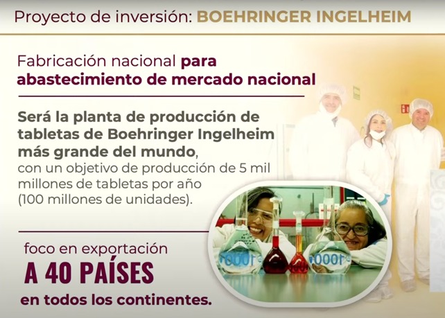 Entre los anuncios, la alemana Boehringer Ingelheim reafirmó su compromiso con el país a través de una inversión multianual de 3,500 millones de pesos, la cual ya ha dado inicio, y está destinada a ampliar y modernizar su planta en Xochimilco, que se convertirá en la de mayor producción de tabletas dentro del grupo Boehringer, superando a sus sitios en España, China, Japón, Grecia y Alemania. Desde esta ubicación y gracias al talento mexicano, la compañía abastece al mercado mexicano con medicamentos antihipertensivos y antidiabéticos, y también exporta a más de 40 países en todos los continentes.