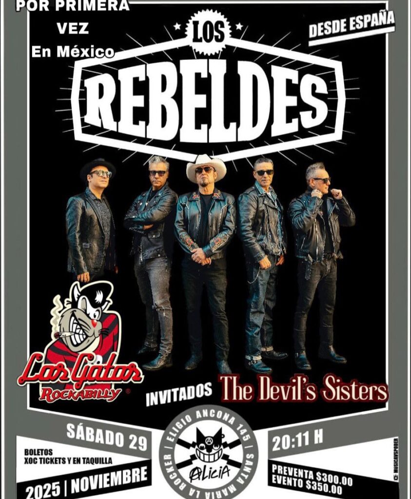 La noche del sábado 29 de noviembre promete convertirse en un rito de comunión entre generaciones, estilos y geografías. El legendario Foro Alicia, bastión de la contracultura capitalina y templo del rock más auténtico, será el escenario donde Los Rebeldes, la banda española más emblemática del rockabilly, desembarque por primera vez en México con su formación completa, encabezada por el carismático Carlos Segarra, pionero del género en la península ibérica y figura esencial en la historia del rock en español. El cartel se complementa con la presencia de Los Gatos Rockabilly y The Devil’s Sisters. Los Boletos tienen un costo en preventa de $300.00